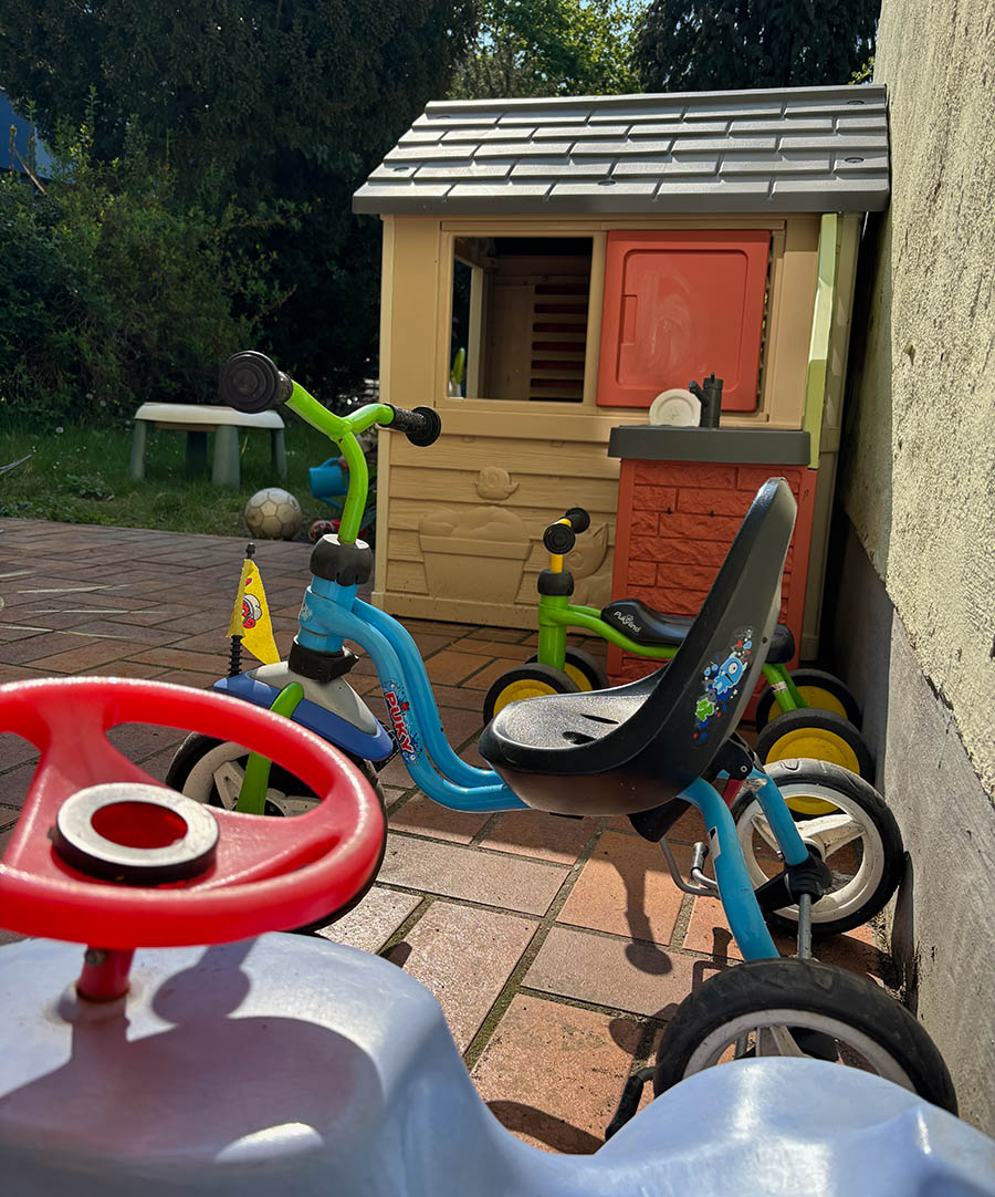 Freies Spiel, kreative Projekte und viel Zeit an der frischen Luft stehen im Mittelpunkt. Die Kinder können sich auf der Terrasse frei bewegen, entdecken und ausprobieren. Dabei lege ich großen Wert auf hochwertige Materialien wie Bücher und Holzspielzeuge, die die Fantasie anregen und die Entwicklung spielerisch fördern.