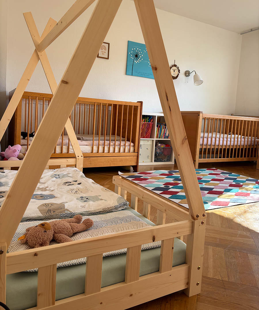 Nach einem erlebnisreichen Vormittag haben die Kinder Zeit zum Ausruhen und Schlafen. Dafür steht ein separater, liebevoll eingerichteter Schlafraum mit eigenen Betten zur Verfügung. Hier können sie zur Ruhe kommen und neue Energie tanken.